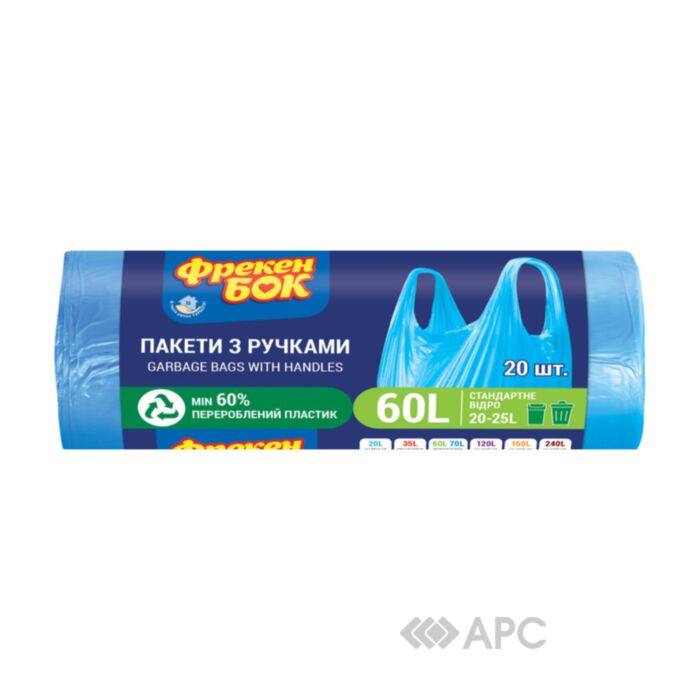 Пакети для сміття Фрекен Бок — це універсальні міцні, сміттєві мішки, що допомагають підтримувати чистоту у вашому домі. В основному використовуються у побуті чи офісних приміщеннях. Виготовляються із якісного, еластичного поліетилену високого тиску,  бірюзового кольору, який має стійкість до проколів. Перевагою даної продукції є те, що мішки в рулоні мають ручки, які спрощують процес виносу відходів.