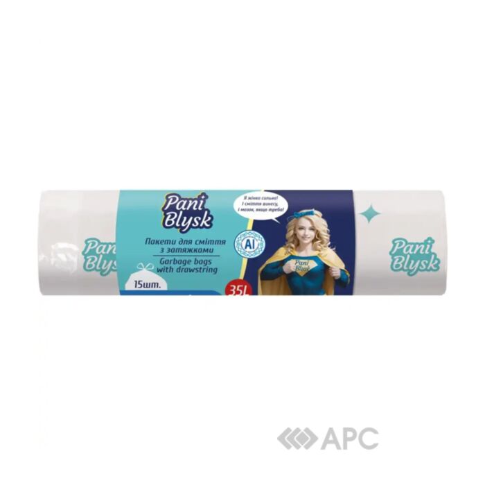 Мішки для сміття Pani Blysk з затяжкою 35 л – це практичне та зручне рішення для ефективного збору та виносу сміття. Комплект складається з 15 пакетів, кожен з яких має об'єм 35 літрів, що робить їх ідеальними для використання в будинках, офісах та інших приміщеннях з помірним обсягом побутових відходів.