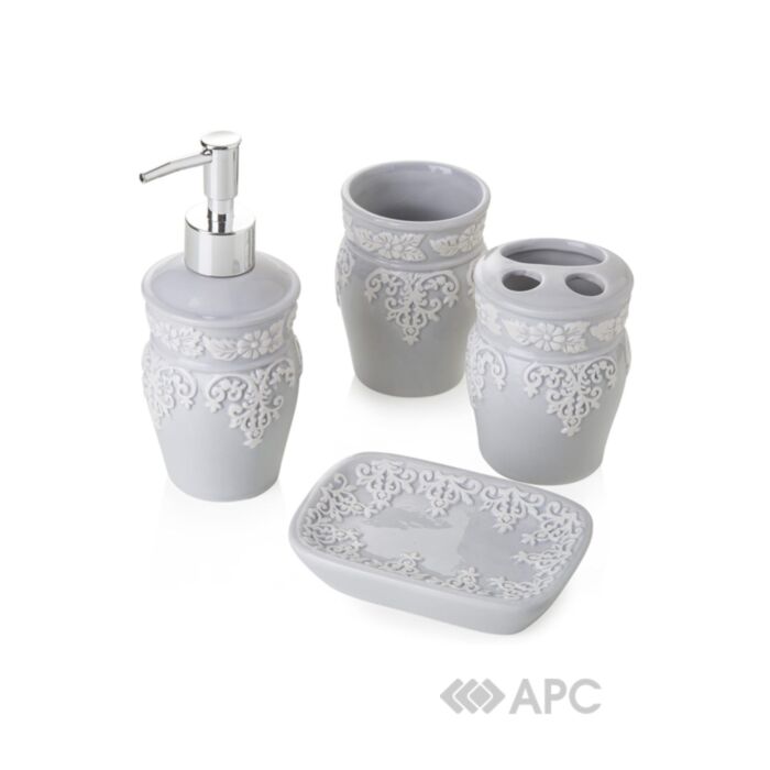 Набір для ванни Bisc Montemaggi — це розкішний спосіб організувати інтер’єр та підтримати один стиль. Набір містить: дозатор для рідкого мила, стакан для зубних щіток, стакан-органайзер та мильницю. Основним матеріалом для кожного елементу є кераміка, що буде ідеальним варіантом для ванної кімнати: вона є стійкою до вологи, корозії, механічних пошкоджень. Навіть через тривалий термін експлуатації, вона збереже свої візуальні та функціональні властивості. Елегантний дизайн з вишуканими формами та ніжними об’ємними візерунками рослинного мотиву найкраще доповнить інтер’єри в стилі бароко, класицизм, романтичний, але також відкриє шалений простір для творчості та інтерпретації в інших стилях. Догляд за аксесуарами не вимагає жодних зусиль: варто всього лиш протирати предмети вологою тканиною та промивати чистою водою.