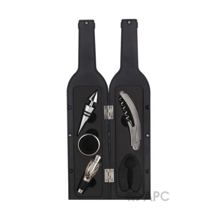 Набір барних аксесуарів KingHoff — це чудовий варіант на подарунок людям, які розбираються у виних напоях та полюбляють їх дегустувати. Привабливе упакування чорного кольору у вигляді пляшки об’ємом 0,75 мл, містить 5 елементів: штопор, різак для фольги, винний кофр, пробка, дозатор для комфортного розливу. Усі приладдя виготовлені з нержавіючої сталі, що забезпечить їх тривалий термін використання.