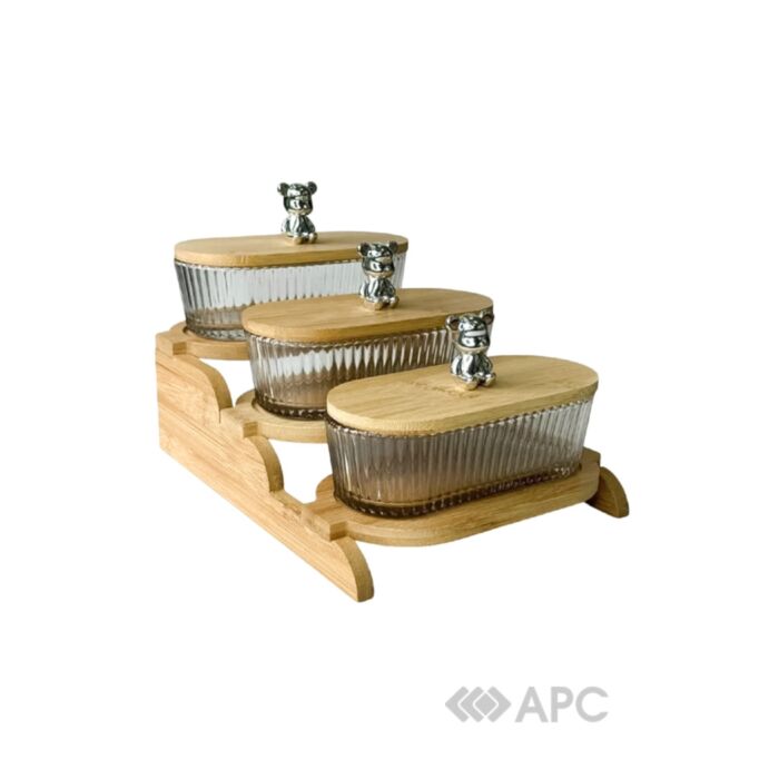 Набір цукерниць на підставці Olens Три ведмеді 102-626 вирізняється оригінальним дизайном, що додає затишку та грайливості будь-якому столу, і особливо добре пасуватиме до дитячих свят або домашніх посиденьок. Три окремі цукерниці зручно розташовані на трьох дерев’яних підставках та закриваються дерев’яними кришками з сріблястими ведмедиками зверху. Матеріали (скло та дерево) є безпечним для харчових продуктів, простими у догляді. Компактний розмір та продуманий дизайн роблять цей набір не лише практичним елементом сервірування, але й чудовим декоративним акцентом, а також гарним подарунком.