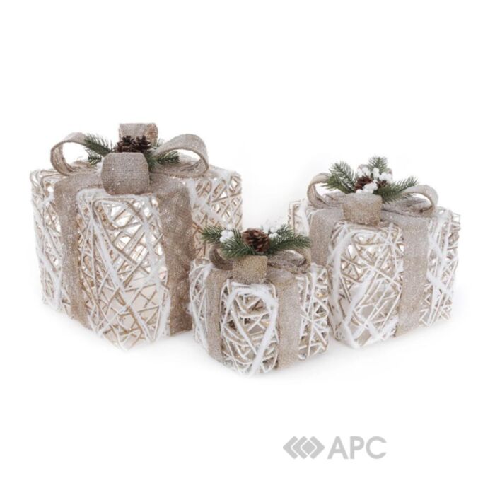 Набір декоративних подарунків BonaDi NY12-487 3 шт стане окрасою вашого інтер'єру, їх можна поставити як під ялинку, так і на стіл або журнальний столик, витончено прикрасивши декоративними стилізованими свічниками, квіткою Пуансетії, новорічним віночком і застеливши різдвяну скатертину.