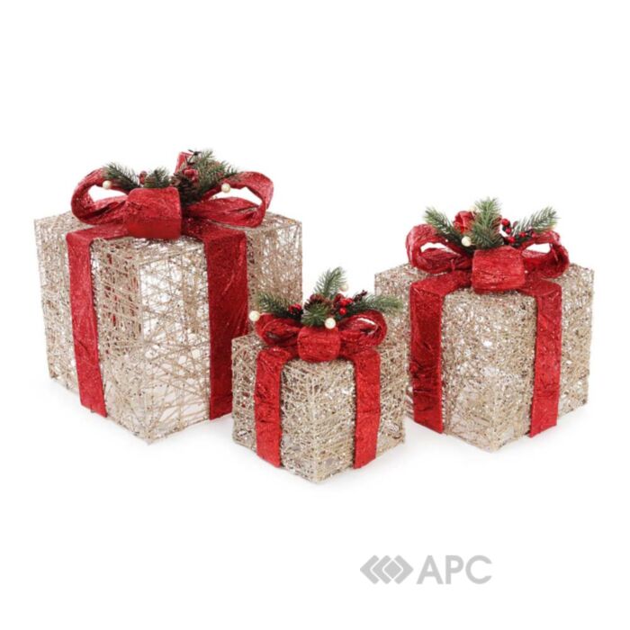 Набір декоративних подарунків BonaDi NY12-492 3 шт стане окрасою вашого інтер'єру, їх можна поставити як під ялинку, так і на стіл або журнальний столик, витончено прикрасивши декоративними стилізованими свічниками, квіткою Пуансетії, новорічним віночком і застеливши різдвяну скатертину.