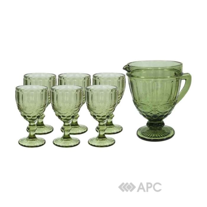Набір Вінтаж - це вишуканий комплект зеленого кольору, який складається з 6 бокалів та 1 глечика. Вироби можуть стати не тільки незамінною частиною побуту, але і відмінним подарунком до будь-якого свята. Елегантні склянки з кольорового скла відрізняються декоративним дизайном та функціональністю, а також підходять для очищення в посудомийній машині.