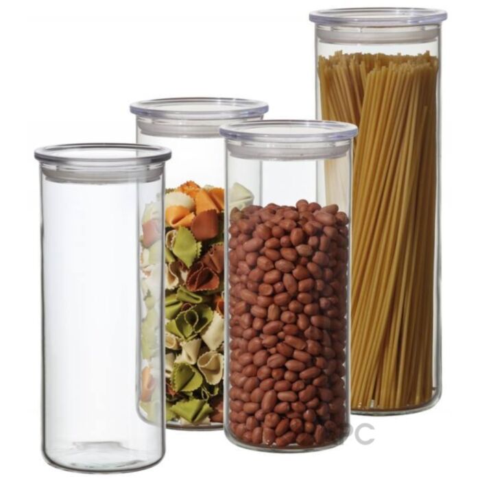 Набір скляних ємностей з пластмасовими кришками можна використовувати для зберігання круп, цукру, макаронів та інших сипучих продуктів. Вони дуже компактні, кришки добре прилягають, що забезпечує збереження того, що там зберігається.