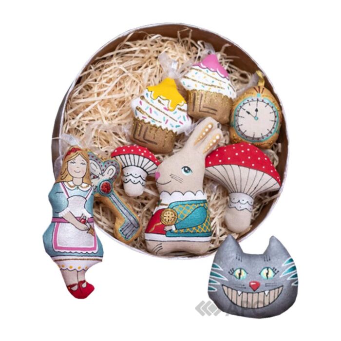 У набір входять 9 іграшок, що зображають персонажів, а також елементи з казки. До складу входять фігурки Аліси, Білого зайця та Чеширського кота. Золотий ключ, великий мухомор, малий мухомор доповнюють комплект, створюючи атмосферу дивовижного світу. Рожевий і жовтий кекс надають йому яскравості та різноманіття.
