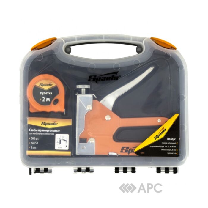 Набір Sparta 42003 – відмінний варіант, який дозволить розпочати роботу в найкоротші терміни. У комплект входить степлер з запасом скоб (500 штук) і вимірювальна рулетка завдовжки 2 метри. За допомогою цього набору ви без зусиль зможете поміняти оббивку улюбленого крісла, перетворити потертий диван в практично новий, а також виконувати безліч інших завдань.