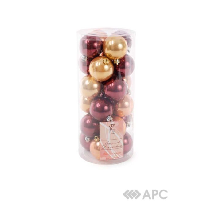 У набір входять пластмасові ялинкові прикраси мікс трьох кольорів - 12 шт коричневого, по 6 шт перламутру світлого золота і міді