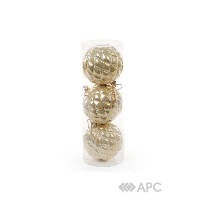 В набір входять пластмасові ялинкові прикраси діаметром 8 см, світло-золотого кольору.