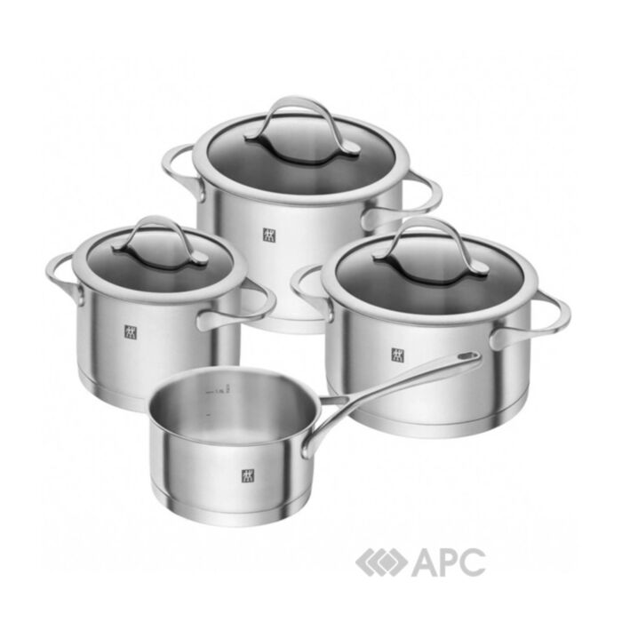 Набір каструль Zwilling Essence 66220-003-0 4 предмети складається із каструль з кришками об'ємом: 1,5; 2; 3; 3,5, діаметром: 16, 16, 20, 24 см. Матеріал виготовлення - нержавіюча сталь. Посуд можна використовувати на різних типах плит, включно з індукційними. Каструлі підходять для миття у посудомийній машині.