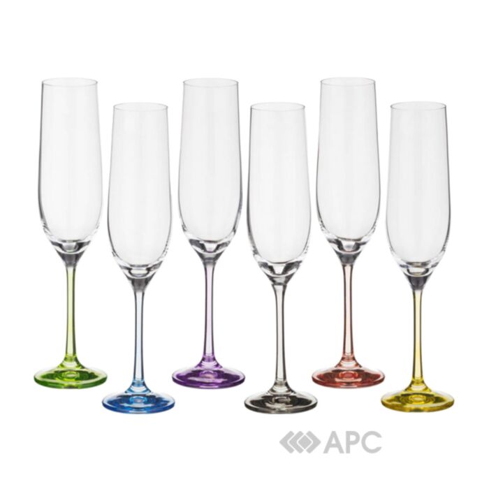 Набір з шести келихів Rainbow Bohemia для шампанського з високоякісного міцного скла. Завдяки високій якості і унікальному дизайну, вони дуже стильно виглядатимуть на столі. Цей посуд призначений для інтенсивного використання. Завдяки потовщеним краям, вироби мають додаткову захищеність від механічних пошкоджень, завдяки цьому збільшується термін служби скляних виробів. Бокали можна мити у посудомийній машині.