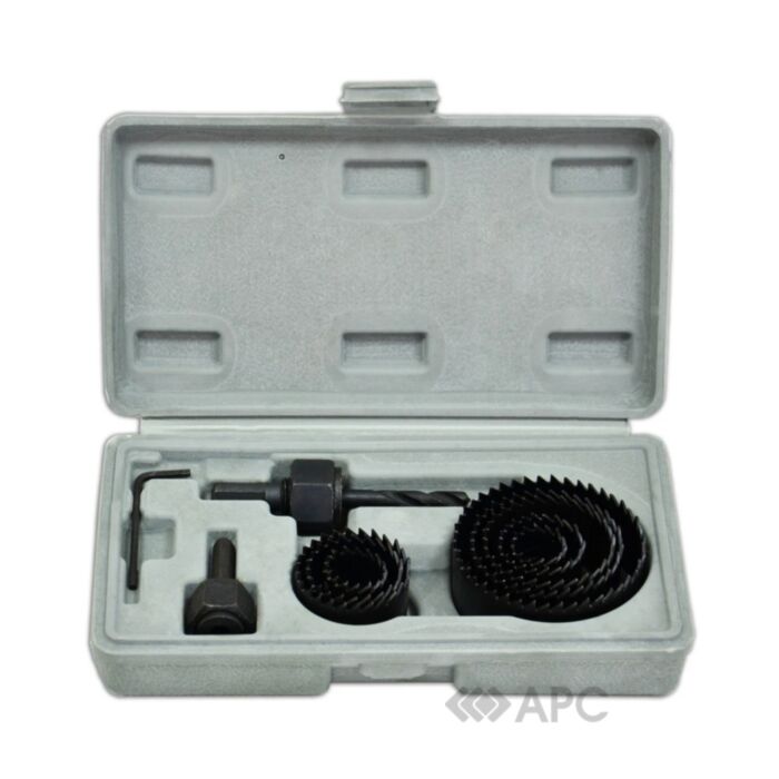 Кільцеві свердла, також можна знайти під назвою «коронки» або «склянки» через їхню форму. Призначені вони для створення наскрізних отворів в плитах різних матеріалів. Даний набір використовується для свердління м'яких матеріалів: дерева, гіпсокартону тощо. У набір входять коронки з вуглецевої сталі, центруюче свердло і затискний шестигранний ключ. Діаметри свердел: 19-64 мм. Кількість предметів у наборі: 11 штук в пластиковому кейсі.