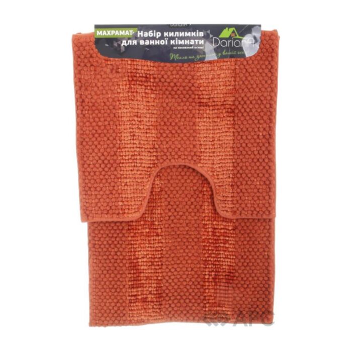 Набір килимків для ванної кімнати Dariana Матрац теракотовий виготовлений із якісних поліестеру та мікрофібри. Матеріали надзвичайно приємні на дотик. Прогумована основа килимків запобігає ковзанню по поверхнях. Килимки чудово втягують вологу. Ворс виробів не вицвітає з часом та не втрачає колір при пранні. Килимки легко чистяться, їх можна випрати у пральній машині, але температура води не повинна перевищувати 30 градусів. Розміри: 55х80 см та 55х50 см.