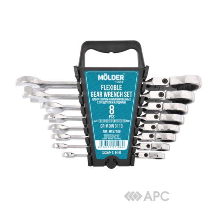 Набір ключів комбінованих Molder — це ідеальний комплект інструментів для монтажу та демонтажу різноманітних різьбових з'єднань у важкодоступних місцях. Завдяки карданному механізму і тріскачці з 72 зубцями, ви зможете працювати навіть під кутом. Виготовляється із хром-ванадієвої сталі, що відрізняється високою міцністю та довговічністю.