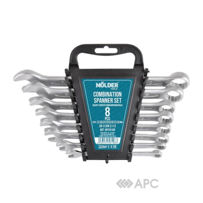 Набір ключів комбінованих Molder MT58108 — універсальний інструмент широкого застосування. З одного боку знаходиться ріжковий ключ з відкритим зівом, з іншого — накидний ключ того ж розміру. Використовується для створення різьбових з'єднань, а також демонтажу: відкручування гайок і болтів. Тому комбінований ключ ще можуть називати «ріжково-накидний». Даний вид гайкових ключів є найбільш затребуваним і поширеним. Комплект налічує 8 ключів розміром: 8, 10, 12, 13, 14, 15, 17, 19 мм.