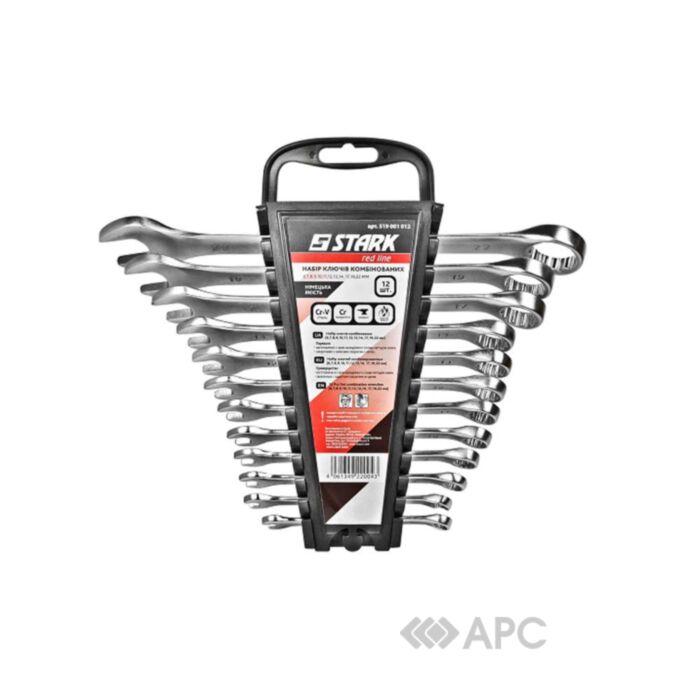 Набір комбінованих ключів Stark 519001012 складається з 12 рожково-накидних CrV-ключів. Необхідний набір в будь-якій сфері, де необхідне здійснення поворотній функції гайок і болтів, а також інших шестигранних різьбових елементів: слюсарні, сантехнічні роботи, обслуговування та ремонт автомобілів. У набір входять ключі розмірів (мм): 6-14, 17, 19, 22.