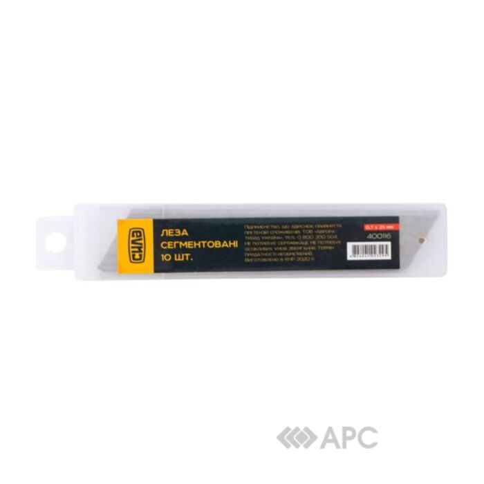Набір лез сегментованих Сила 400116 — це металеве полотно, яке призначене для будівельного ножа, використовується для зачистки проводів, різання картону, паперу, пінопласту, шкіри та інших матеріалів. Виготовляється із сталі, ширина 25 мм. У набір входить 10 штук, легко замінюються, а також зручні у використанні, оскільки дуже гострі.