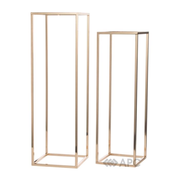 Набір підставок для вазонів Art-pol 130952 - включає дві металеві підставки золотого кольору, призначені для розміщення квіткових горщиків. Обидві мають каркасну конструкцію у формі прямокутних паралелепіпедів з порожнистим верхом для встановлення вазонів.
