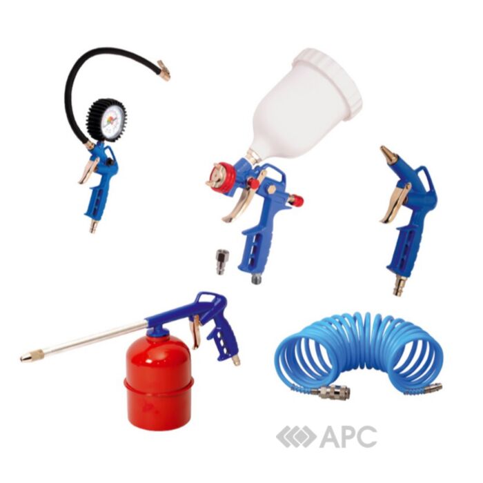 Включає 5 предметів: з'єднувальний шланг, довжиною 5 м; пістолет для продувки; пневмозатвор із манометром; фарборозпилювач пневматичний з верхнім бачком; пістолет для промивання поверхонь сильним струменем.