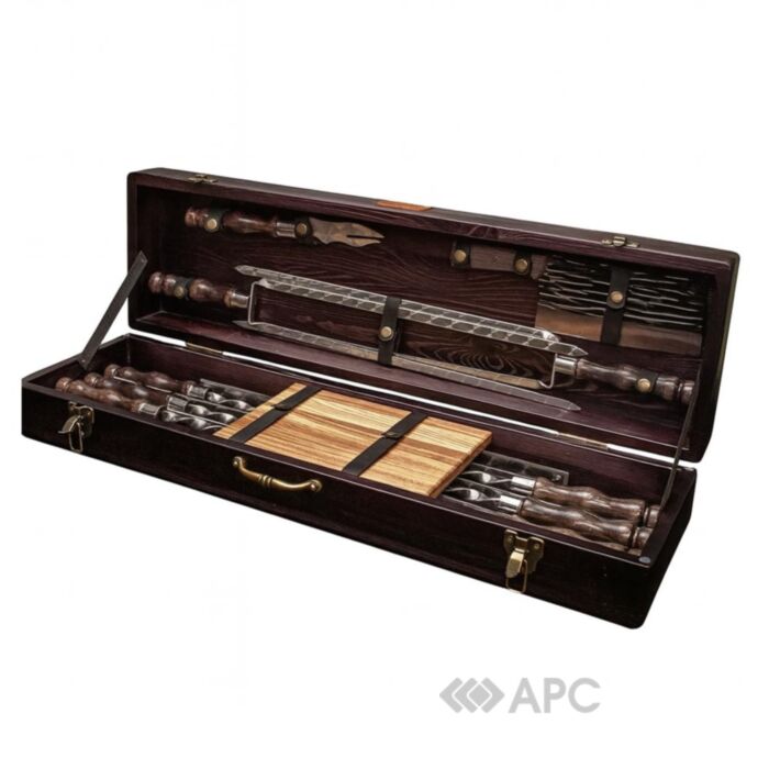 Склад набору включає: 6 шампурів, 2 подвійні шампури, 2 стійки-мангал, ніж-виделку для зняття м'яса, ніж-тесак та кухонну дошку. Кейс, виготовлений з ясеня, має вагу 9 кг та габаритні розміри 79 см * 22 см * 14 см.