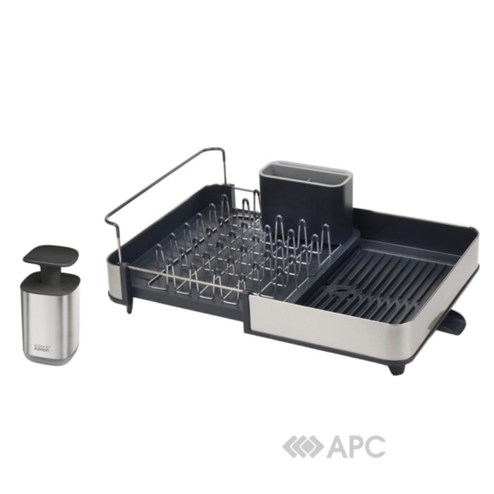 Набір сушка для посуду та дозатор для рідкого мила Joseph Joseph 85189 – це стильний і функціональний комплект, який підвищить ефективність кухонної мийки. Сушарка для посуду з нержавіючої сталі висувається, що дозволяє збільшити її місткість майже вдвічі, коли це необхідно. Вона оснащена зливним носиком, тримачем для обробної дошки, піднятими ребрами для запобігання застою води та пересувною ємністю для столових приладів. Це робить її ідеальним вибором для організації посуду після миття, забезпечуючи його швидке висихання і зручне зберігання.