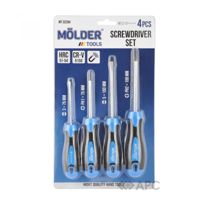 Набір викруток Molder MT32204 4 шт — це чудовий вибір як для домашнього, так і професійного використання. Стрижні з намагніченим наконечником виготовлені з міцної хром-ванадієвої сталі. Ручки прогумовані, що забезпечить антиковзкий ефект та надійну фіксацію у руці майстра. Моделі оснащено отвором для зручного підвішування на панелі для інструментів. У комплект входять викрутки: PH1x75, РН2х100, SL3х75, SL5х100 мм.