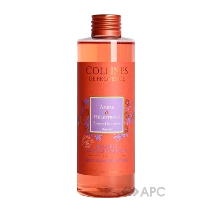 Наповнювач для дифузора Collines de Provence Амбра і геліотроп C2803AHE 200 мл використовується в процесі наповнення ємності з паличками для продовження ароматерапії. Рідина знаходиться в банці зі щільно закритою кришкою, тому її можна зберігати тривалий час та підливати субстанцію по мірі необхідності. Склад продукту складається з спирту, ефірних масел та природних ароматів, які не шкодять здоров'ю і не викликають алергію. Завдяки використанню паличок аромат поширюється більш інтенсивно, а якщо поставити аромадифузор на сонці, то букет запахів розкриється максимально повно.