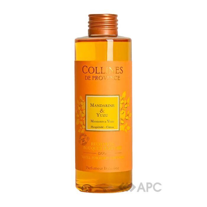 Наповнювач для дифузора Collines de Provence Мандарин і юдзу C2803MYU 200 мл використовується в процесі наповнення ємності з паличками для продовження ароматерапії. Рідина знаходиться в банці зі щільно закритою кришкою, тому її можна зберігати тривалий час та підливати субстанцію по мірі необхідності. Склад продукту складається з спирту, ефірних масел та природних ароматів, які не шкодять здоров'ю і не викликають алергію. Завдяки використанню паличок аромат поширюється більш інтенсивно, а якщо поставити аромадифузор на сонці, то букет запахів розкриється максимально повно.