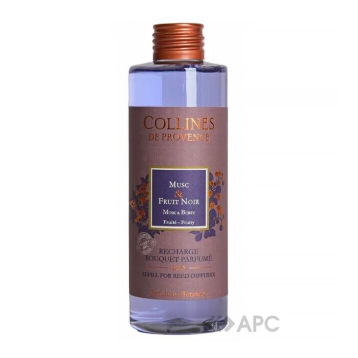 Наповнювач для дифузора Collines de Provence Мускус і ягоди C2803MFR 200 мл використовується в процесі наповнення ємності з паличками для продовження ароматерапії. Рідина знаходиться в банці зі щільно закритою кришкою, тому її можна зберігати тривалий час та підливати субстанцію по мірі необхідності. Склад продукту складається з спирту, ефірних масел та природних ароматів, які не шкодять здоров'ю і не викликають алергію. Завдяки використанню паличок аромат поширюється більш інтенсивно, а якщо поставити аромадифузор на сонці, то букет запахів розкриється максимально повно.