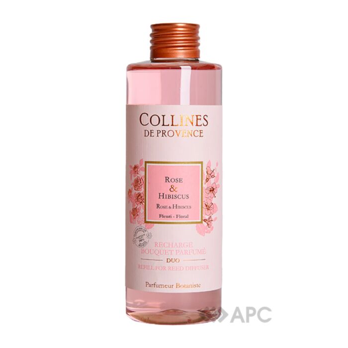 Наповнювач для дифузора Collines de Provence Троянда і Гібіскус C2803RHI 200 мл використовується в процесі наповнення ємності з паличками для продовження ароматерапії. Рідина знаходиться в банці зі щільно закритою кришкою, тому її можна зберігати тривалий час та підливати субстанцію по мірі необхідності. Склад продукту складається з спирту, ефірних масел та природних ароматів, які не шкодять здоров'ю і не викликають алергію. Завдяки використанню паличок аромат поширюється більш інтенсивно, а якщо поставити аромадифузор на сонці, то букет запахів розкриється максимально повно.