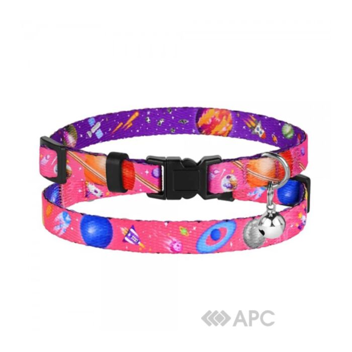 Нашийник для котів BronzeDog Urban Космос 49/1217/Т XS 18-28 см — це щоденний комфорт та індивідуальний стиль вашого улюбленця. Виготовлений з міцного та водночас легкого і якісного нейлону, що не вигорає на сонці та не втрачає кольору після прання. Він м’який, приємний на дотик, гнучкий та невибагливий в догляді. Красивий нашийник дає розуміти оточенню, що у тварини є власник. Пластикова пряжка автоматично розкривається у разі натягу, що гарантує безпеку тварини на прогулянці та допомагає легко звільнитися, якщо раптом вона за щось зачепилася. Маленький дзвіночок допоможе завжди розуміти, де саме знаходиться ваш кіт. Естетичний аксесуар покращить безпеку та підкреслить красу вашого улюбленця.