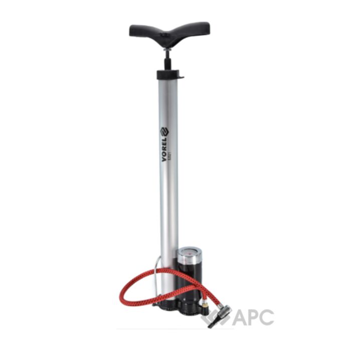 Ручний насос з манометром Vorel 82021 оснащений спеціальною головкою для накачування автомобільних та велосипедних клапанів. Модель з максимальним тиском 10 бар виготовлена з алюмінію та міцного пластику. Тверда основа надійно фіксується під ногами, що значно полегшує тривалу роботу.