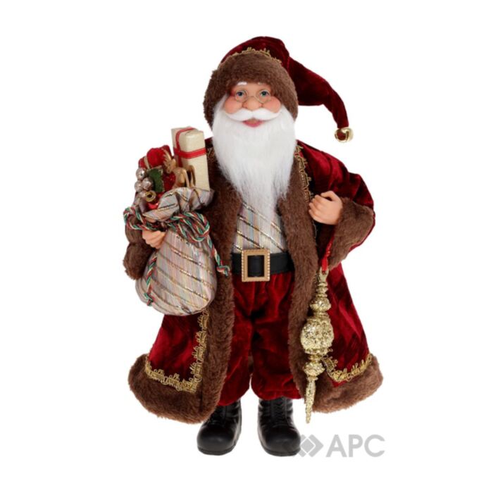 Новорічну іграшку Санта з подарунками BonaDi 845-255 40 см червону можна поставити як під ялинку, так і на стіл або журнальний столик, витончено прикрасивши декоративними стилізованими свічниками, квіткою Пуансетії, новорічними віночками й застеливши різдвяну скатертину.