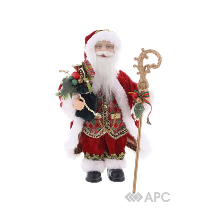 Новорічна іграшка Санта з подарунками BonaDi NY44-140 30 см червона — це фігурка неперевершеної краси, що створить справжню атмосферу свята. Вона радуватиме око дітей, дорослих, гостей оселі, а також буде чудовим подарунком. Являє собою статуетку Санти, що в руках тримає посох та мішок, наповнений подарунками. Виготовлена модель в традиційних кольорах: червоному, зеленому, золотому та білому.