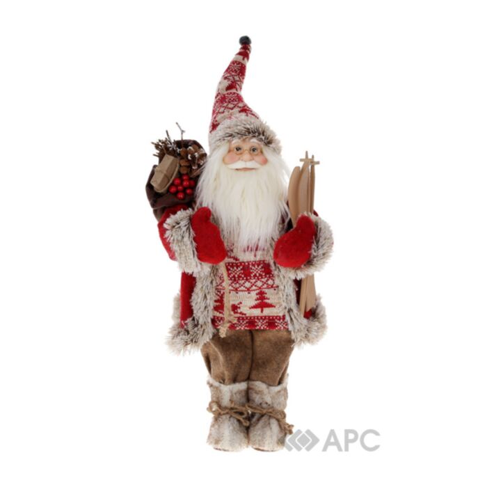 Новорічна іграшка Санта з подарунками BonaDi 45 см червона з коричневим — це справжній мистецький елемент, що наповнить оселю теплом та святковою атмосферою. Вона стане ідеальним подарунком та буде приносити радість дітям, дорослим та гостям будинку. Являє собою фігурку усміхненого Санти, що спішить на лижах роздати презенти усім охочим: на руках у нього рукавички, а в мішку — зимові ягоди, притрушені снігом та дарунки. Образ доповнюють хутряні чобітки, кожух та теплий ковпак. Колірна гама виконана в приємних червоних та коричневих відтінках, тому обов’язково доповнить будь-який інтер’єр.