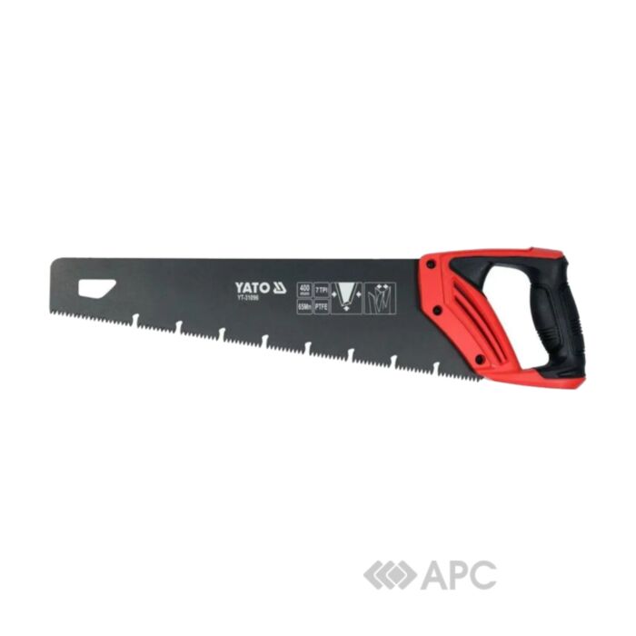 Ножівка по дереву Yato YT-31096 400 мм — пила для різання дерева та матеріалів на її основі, таких як фанера, ДСП, МДФ тощо. Лезо виготовлене з марганцевої сталі типу Mn65, що має високу стійкість до стирання та деформації. Зубці пилки виготовлені зі спеціального тристороннього профілю, який здатний витримувати активну експлуатацію, також поверхня леза покрита шаром PTFE (політетрафторетилен) для зменшення тертя.