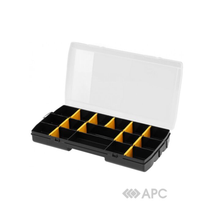 Мабуть кожен майстер стикався з тим, що не міг знайти потрібну гайку чи болт в коробці з інструментами. І на пошуки потрібної деталі йшло багато часу та сил. Адже часто буває, що найменші деталі опиняються на самому дні. Аби уникнути таких ситуацій, потрібно використовувати органайзер — ящик з відсіками для зручного групування фурнітури. Завдяки Stanley STST81680-1 ви з легкістю знайдете потрібну вам деталь. Корпус виготовлений із пластику, який славиться своєю легкістю, а це означає, що органайзер легко носити з собою. Дану модель можна використовувати як самостійний елемент для зберігання, або ж як доповнення до ящика з інструментам.