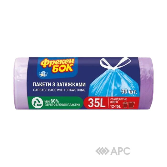 Пакети для сміття Фрекен Бок Стандарт із затяжкою 35 л 30 шт — це універсальні, міцні, сміттєві мішки з затяжками та прямим дном, без швів. Виготовляються із якісного, спеціального поліетилену, що забезпечує еластичність, герметичність та стійкість до проколів. Ручки затяжки створюють комфорт при виносі, найбільше підходять для побутового, а також офісного використання. Продукція від українського виробника користується високою популярністю серед домогосподарок.