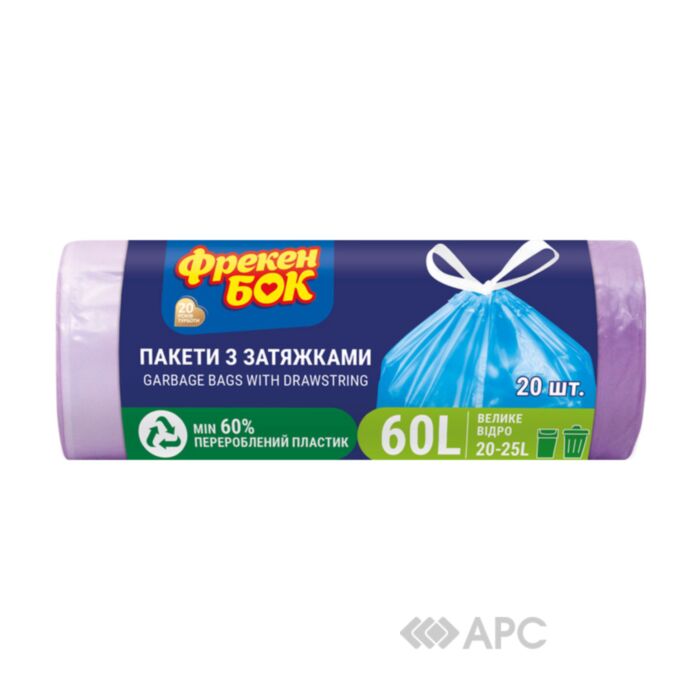 Пакети для сміття Фрекен Бок Стандарт із затяжкою 60 л 20 шт — це універсальні, міцні, сміттєві мішки з затяжками та прямим дном, без швів. Виготовляються із якісного, спеціального поліетилену, що забезпечує еластичність, герметичність та стійкість до проколів. Ручки затяжки створюють комфорт при виносі, найбільше підходять для побутового, а також офісного використання. Продукція від українського виробника користується високою популярністю серед домогосподарок.