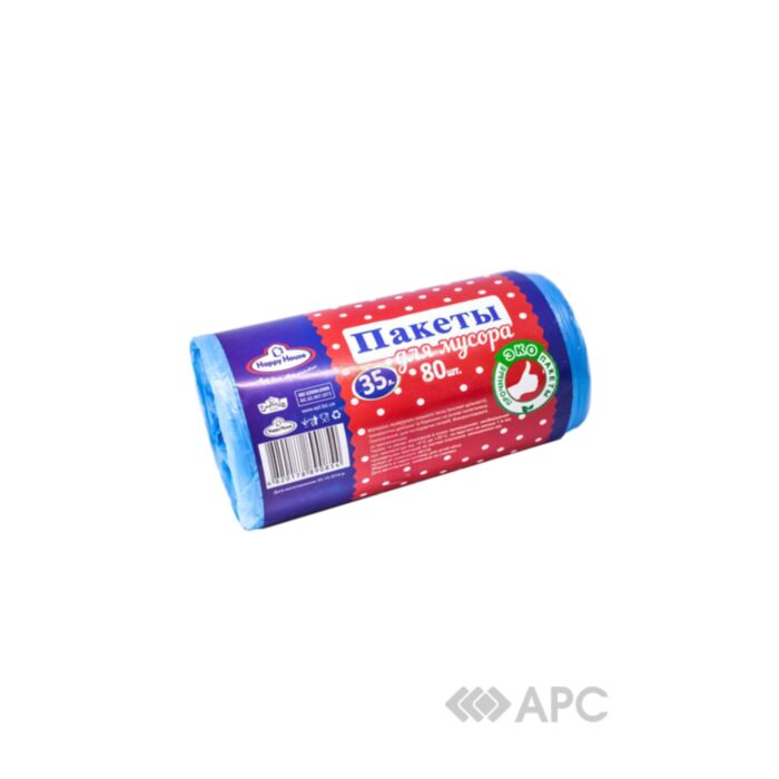 Пакети для сміття Happy House — це універсальні мішки від українського виробника, що допомагають підтримувати чистоту у вашому домі чи на офісі. Виготовляються із поліетилену низького тиску (високої щільності), блакитного кольору, екологічні, не мають зав’язок. Об’єм 35 л підходить для стандартного відра чи кошика від 15 л. Упакування налічує 80 штук, яких вистачить на тривалий термін користування.