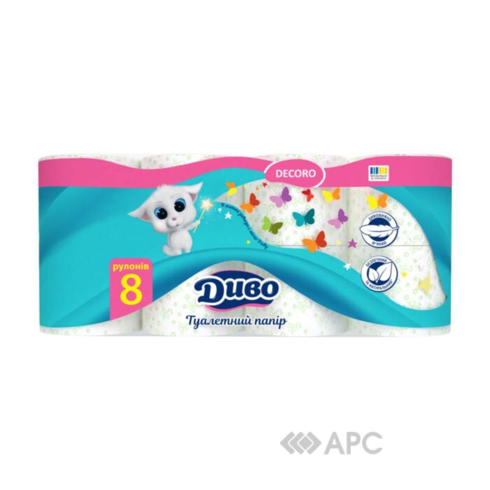 Папір туалетний Диво Decoro— це універсальна продукція для інтимної гігієни, яка займає важливе місце у нашому житті. Виготовляється із 100% целюлози, білого кольору, двошарового типу. Має м’яку та приємну на дотик структуру, з тисненням, що додатково скріплює листи між собою, немає запаху. Розміщується на втулці, що робить користування ще зручнішим. Перевагою виробу є перфорація, яка створює легке відривання листів. Упакування вміщує 8 рулонів.