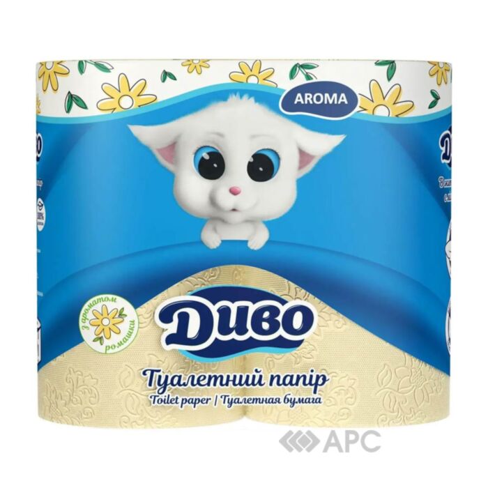 Папір туалетний Диво — це універсальна продукція для інтимної гігієни, яка займає важливе місце у нашому житті. Виготовляється зі 100% целюлози, жовтого кольору, двошарового типу. Має м’яку та ніжну на дотик структуру, приємний запах ромашки. Розміщується на втулці, що робить користування ще комфортнішим. Перевагою виробу є перфорація, яка створює легке відривання листів. Упакування вміщує 4 штуки, рулони мають по 185 відривних листів, розміром 11,5х10 см.