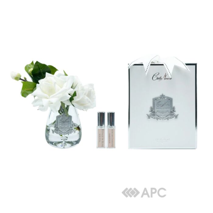 Тринадцять бутонів розміщені в розкішній гранованій вазі. Кожна квітка просочена фірмовим ароматом Ivory White Clear від Cote Noire, в якому верхні ноти троянди нашаровуються на ноти трояндового листя та мускусу. До букета додаються два флакони ароматизованих парфумів об'ємом 10 мл. Щоб мінімізувати ризики висихання квітів, рекомендовано регулярно обприскувати пелюстки водою. Парфумований букет Cote Noire стане чудовим доповненням до будь-якого інтер'єру. Це ідеальний спосіб створити атмосферу романтики та вишуканості у вашому домі.