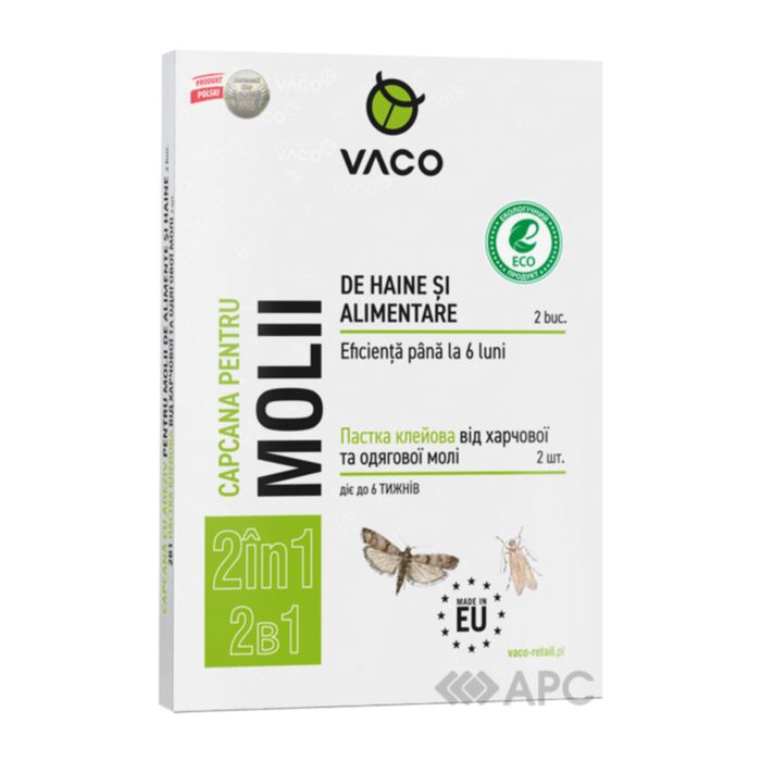 Клейова пастка від молі Vaco Eco є ефективним засобом виявлення та знищення шкідників у приміщенні. Дія засобу спрямована на приваблення метеликів феромонами до липкої поверхні, яка знерухомлює комаху. Рекомендовано розміщувати у шафах, коморах, вбиральнях та в закритих місцях зберігання харчових продуктів чи одягу. Після прилипання молі слід ретельно оглянути речі для виявлення пошкоджень. Vaco Eco захищає дім протягом 6 тижнів від початку встановлення, після чого пастку слід замінити. Це забезпечить повний контроль над шкідниками та запобігає їх подальшому поширенню.