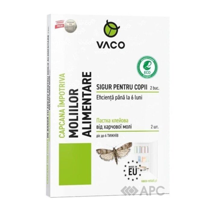 Пастка клейова Vaco Eco від харчової молі 2 шт – це ефективний та екологічний засіб знищення комах, що можуть пошкодити харчові продукти. Вона містить феромони, що приваблюють самців харчової молі, та клейку поверхню, до якої комахи прилипають і не можуть більше звільнитися. Зниження кількості самців призводить до поступового зниження популяції. Не містить інсектицидів, тому безпечна для людей і тварин. Компактна конструкція дозволяє розміщувати засіб в шафах, полицях, поруч з продуктами. Одна пастка може працювати до 2-3 місяців, заміну проводять після повного заповнення комахами. Vaco Eco – це чудовий вибір для підтримання чистоти в місцях зберігання продуктів.