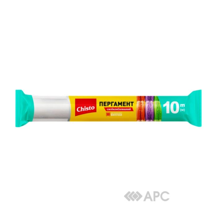 Пергамент для запікання Chisto — це тонкий, білий лист покритий тонким шаром силікону, що допомагає без лишніх проблем запекти харчові продукти, які мають не високий рівень вологості. Виділяється простотою використання, адже потрібно просто відрізати відповідну довжину. Допомагає зберігати форму чистою, безпечний для здоров’я. Перед застосуванням обов’язково потрібно змастити форму олією і не випікати при температурі понад 220 °C. Продукція українського виробника доступна всім, адже виділяється своєю вигідною ціною. Довжина виробу 10 м, ширина 28 см.
