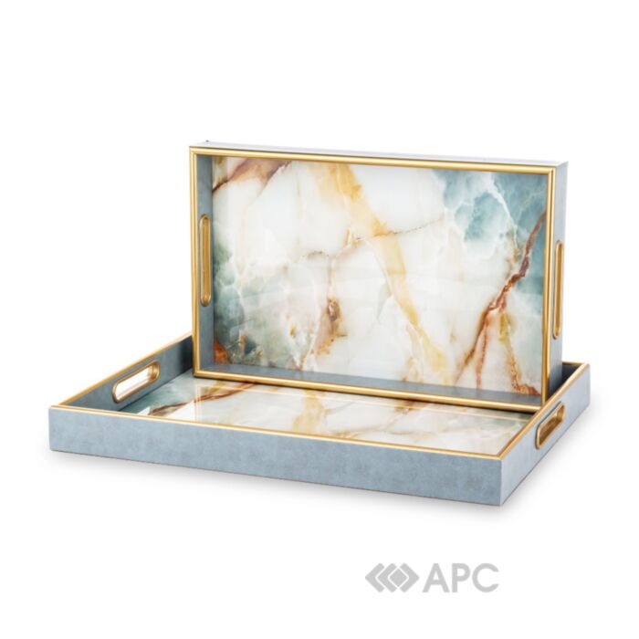 Піднос Art-Pol — це спеціальний посуд від польського виробника, що призначений для подачі їжі та напоїв, або перенесення посуду. В ньому зручно подавати сніданок у ліжко, адже завдяки високим бортикам шанс перекинути страву є досить низький. Виділяється сучасним дизайном, виготовляється з МДФ в блакитному та золотому кольорах. Такий виріб стане окрасою будь-якої кухні, адже всередині розміщується оригінальний мармуровий малюнок. Розміри товару 40,5х25х4,5 см.