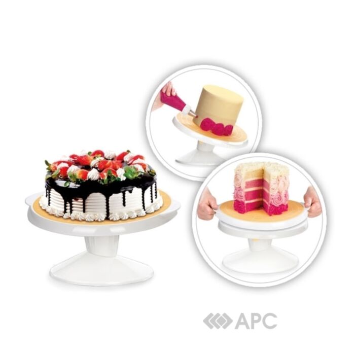 Підставка, що обертається Tescoma "Delicia", виконана з високоякісного пластику, відмінно підходить для декорування і сервірування випічки. Виріб оснащений обертаючою поверхнею з силіконовою основою, яка запобігає ковзанню торта. Поверхня є знімною для збереження максимального простору після використання. Силіконова основа має маркери для поділу випічки на 12 рівних частин.