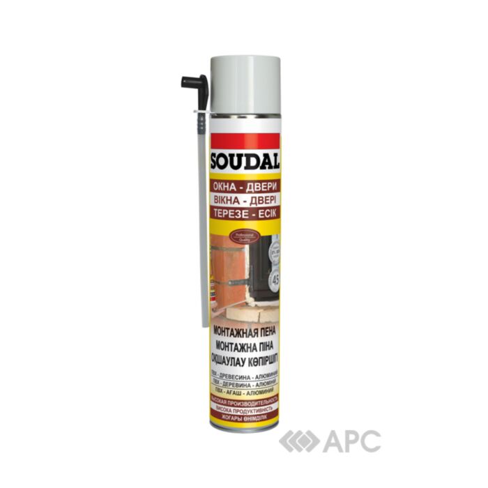 Піна монтажна Soudal 45 ручна 500 мл - швидковисихаючий поліуретановий клей в аерозолі з винятковою адгезію до більшості будівельних матеріалів, в тому числі вологих матеріалів. Готовий до застосування - досить струснути балон, не вимагає ніяких додаткових інструментів. Ідеально підходить для декоративних та оздоблювальних робіт. При необхідності можна штукатурити і фарбувати багатьма видами фарб. Клас пожежної безпеки В2.