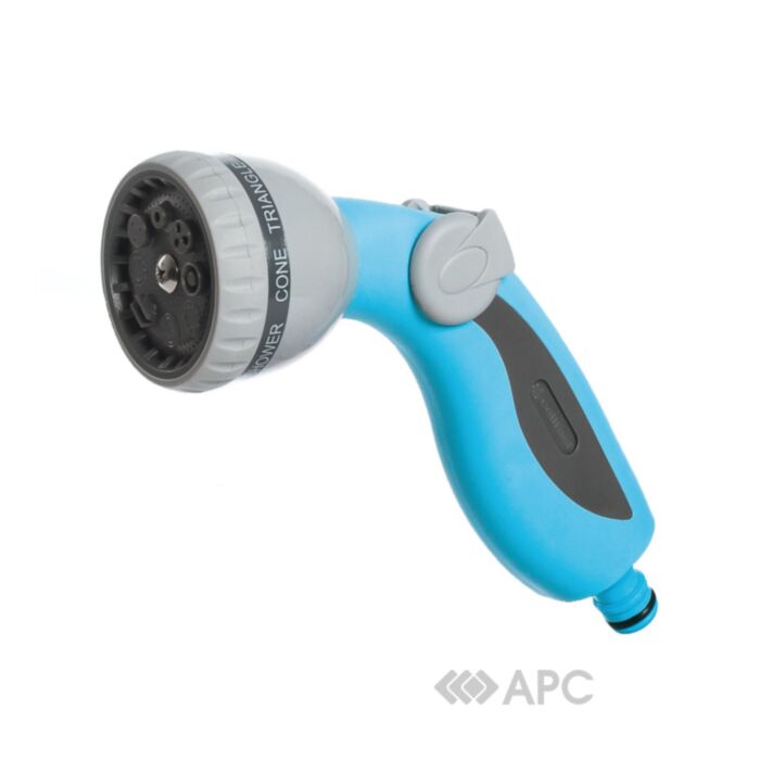 Пістолет-розпилювач встановлюється на шланг для поливу і здійснює зрошення рослин точним і делікатним способом. Корпус виробу виконаний з якісного пластику. Він оснащений ергономічною ручкою з фіксатором, що дозволяє здійснювати безперервний полив, і вісьмома режимами поливу: від точкової струї до розпилення. Пістолет для поливу - це можливість контролювати рівень витрати води та поливати навіть найвіддаленіші куточки ділянки.